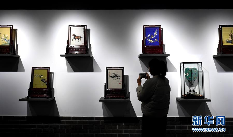 12月14日,游客在河北定州缂丝传习基地参观缂丝作品。 定州缂丝是一种以蚕丝为原料,采用“通经断纬”技法织成的双面平纹织物,工艺繁杂,经得起摸、擦、揉、搓、洗,有着“千年不坏的艺术织品”之誉,2013年被列入河北省第五批非物质文化遗产名录。近年来,河北定州积极推介缂丝,促进缂丝产业发展。 新华社记者 王晓 摄