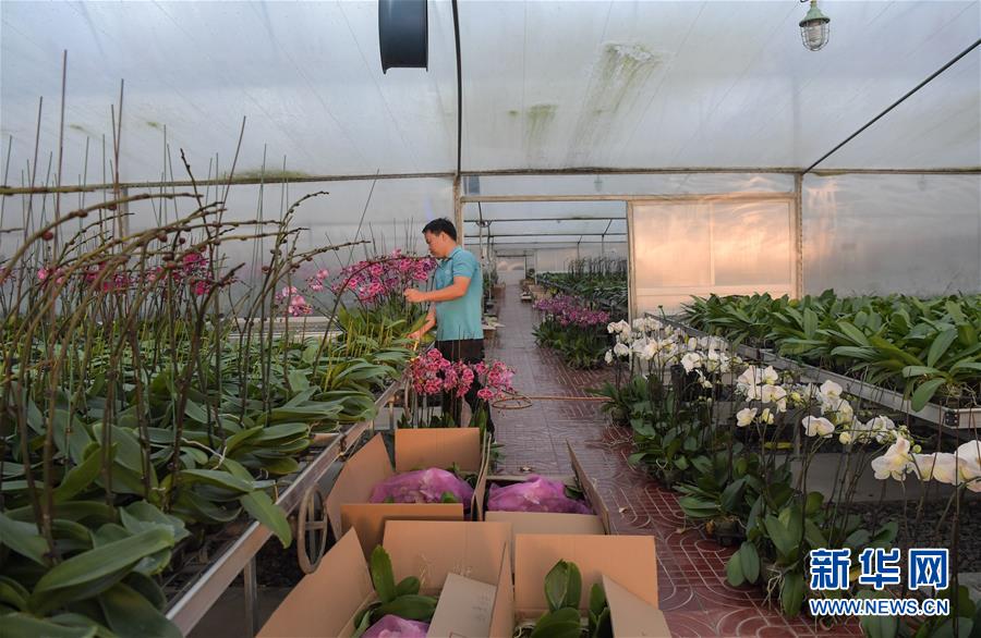 12月14日,工作人员在海口兰花产业园温室内查看兰花。新华社记者 蒲晓旭 摄