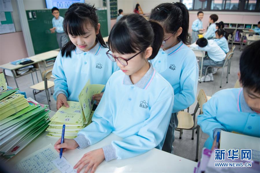 11月25日,喻彦茜(前左一)与同学在教室里整理作业本。新华社记者 张金加 摄
