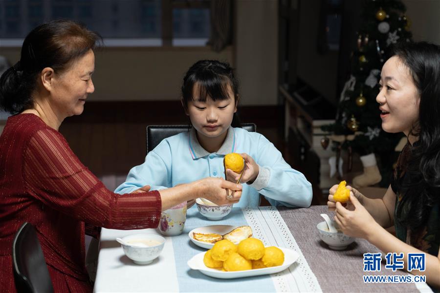 11月25日,喻彦茜(中)和妈妈、外婆一起吃早餐。新华社记者 张金加 摄