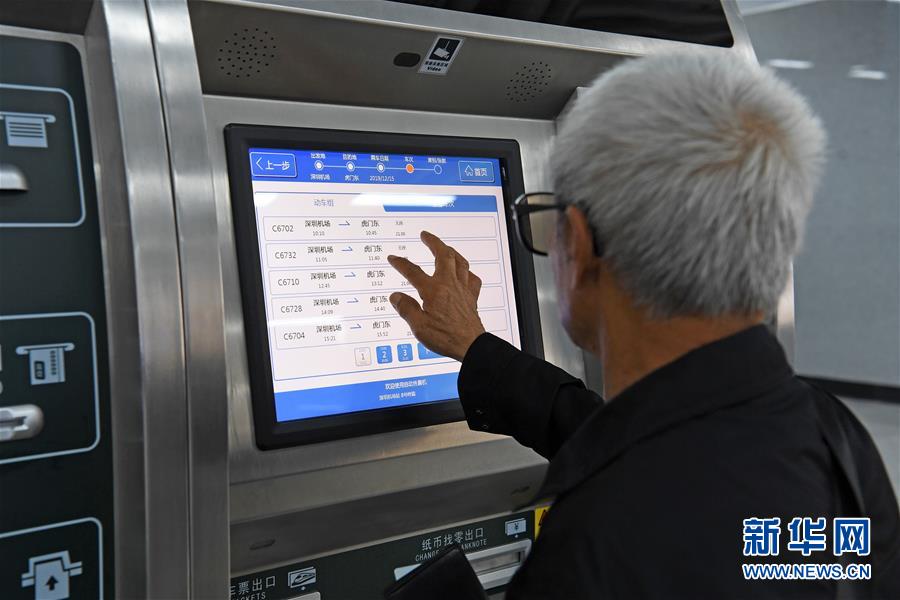12月15日,一位老人在深圳机场站使用自动售票机购票乘车。 当日,穗深城际铁路正式开通运营,设计时速140公里/小时。全线设新塘南站和深圳机场站等15个车站。该线路采用公交化运营,不按座位售票,不用对号入座,可随时买票随时出行。这条新的广深客运大通道使广州、东莞和深圳三地与珠江东岸的诸多地区进入“一小时经济圈”。 新华社记者 梁旭 摄