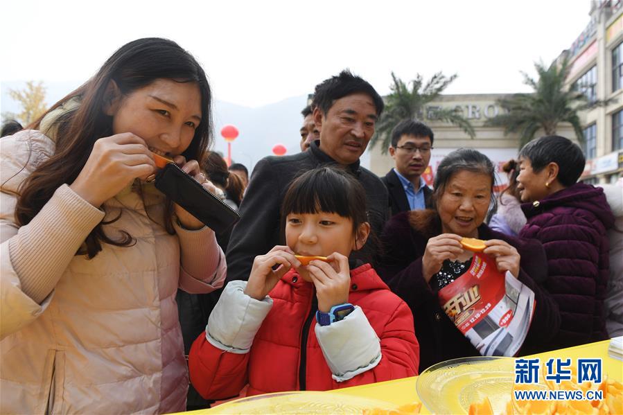 12月15日,观众在重庆奉节国际橙博会上品尝脐橙。新华社记者 王全超 摄