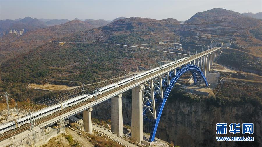 12月16日,一列动车组列车从成贵高铁西溪河大桥上驶过(无人机拍摄)。当日,成贵高铁全线通车。成贵高铁起于四川省成都市,终至贵州省贵阳市,线路全长648公里,设计时速250公里。新华社记者 杨文斌 摄