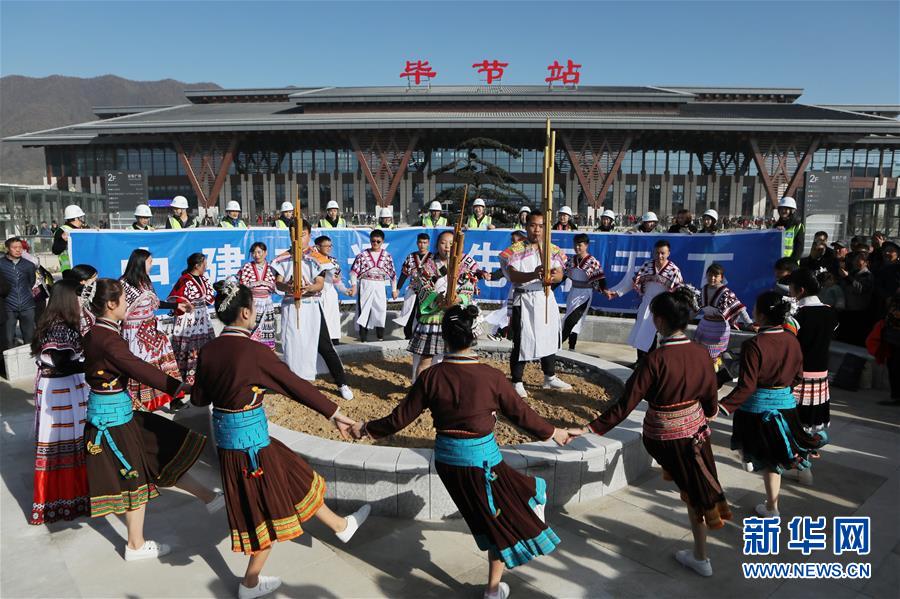 12月16日,少数民族同胞在成贵高铁毕节站前跳芦笙舞,庆祝成贵高铁全线通车。 当日,成贵高铁全线通车。成贵高铁起于四川省成都市,终至贵州省贵阳市,线路全长648公里,设计时速250公里。 新华社记者 欧东衢 摄