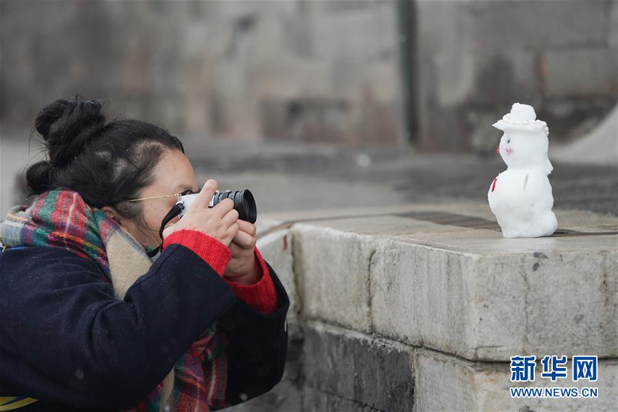 12月16日,在北京天坛公园,一名女士拍摄小雪人。 当日,北京迎来降雪天气。 新华社记者 鞠焕宗 摄