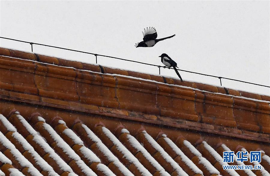 12月16日,在北京故宫,两只喜鹊停在太和殿上。 当日,北京迎来降雪天气。 新华社记者 金良快 摄