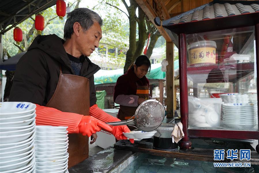 在四川省长宁县双河镇,“葡萄井凉糕”店员在准备凉糕(12月10日)。新华社发(胥冰洁 摄)