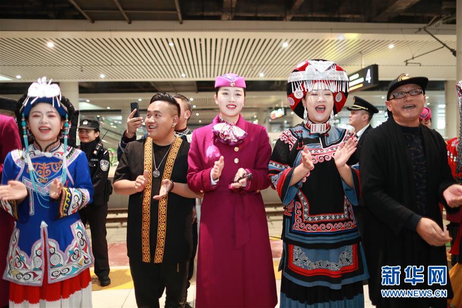 12月16日,在贵阳北站,C6008次列车乘务员在出发前和身着彝族服装的演员共同迎接旅客。新华社记者 刘续 摄