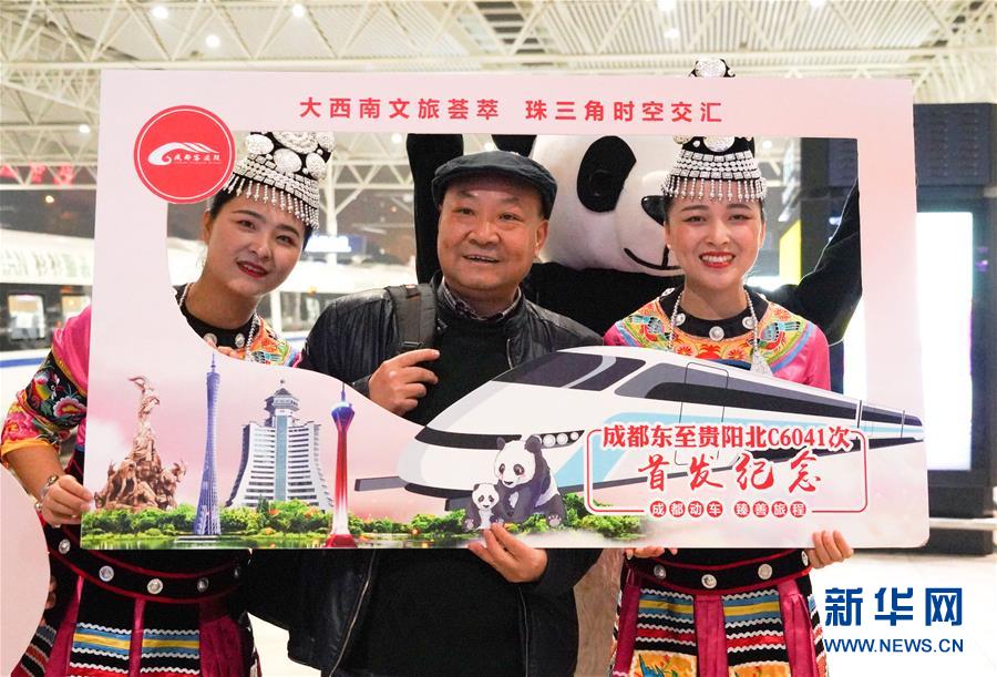 12月16日,在成都东站,乘坐成贵高铁首班车的乘客(中)在发车前留影。新华社发(胥冰洁 摄)