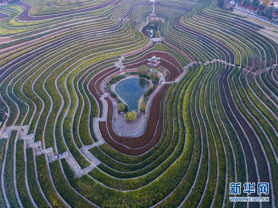 12月16日无人机拍摄的贵州省大方县奢香古镇“城市梯田”景观。寒冬时节,贵州省毕节市大方县奢香古镇的“城市梯田”绿意盎然,层层叠叠、线条分明。大方县奢香古镇是该县易地扶贫搬迁安置区,近年来在规划时把田园风光带入城镇建设,在古镇中心建设了12万平方米的“城市梯田”,种植观赏茶树、玫瑰花等观赏类植物,既扮靓了移民小区,又美化了城镇。新华社记者 杨文斌 摄
