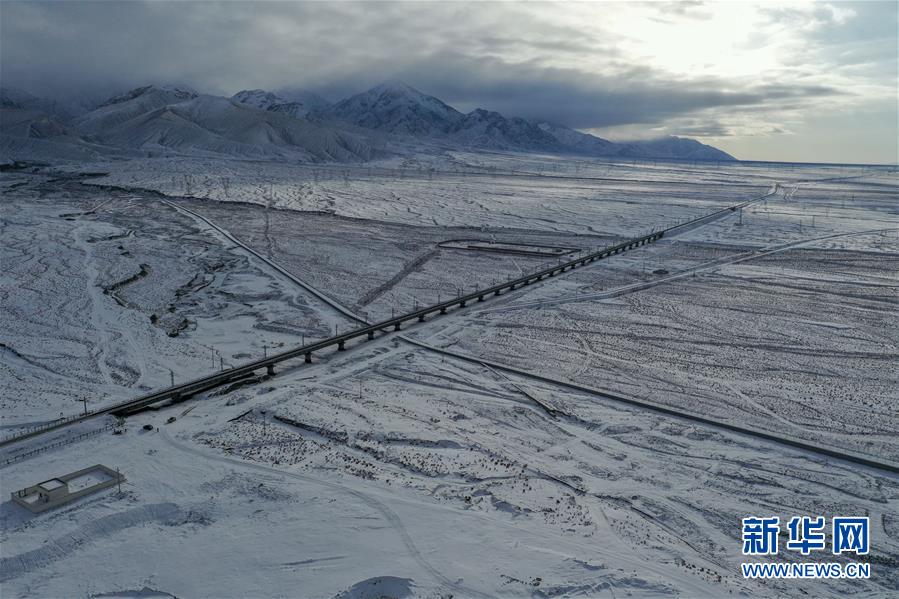 这是12月16日无人机拍摄的敦煌铁路大柴旦站附近的一处铁路桥。 12月18日,随着肃北至马海区段通车,敦煌铁路全线开通运营,中国西北地区形成首条环形铁路网。 新华社记者 张龙 摄