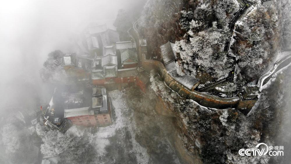 近日,中东部一轮大范围雨雪天气陆续上线,地处中国版图中心方位的武当山也迎来了冬雪。云雾缭绕,雨雪梳妆,宛若仙境。这里的古建筑群依山就势,追求着与自然的和谐统一。(刘亮 摄)