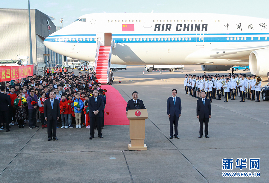 12月18日,中共中央总书记、国家主席、中央军委主席习近平乘专机抵达澳门,出席将于20日举行的庆祝澳门回归祖国20周年大会暨澳门特别行政区第五届政府就职典礼并视察澳门。这是习近平在机场发表重要讲话。 新华社记者 庞兴雷 摄