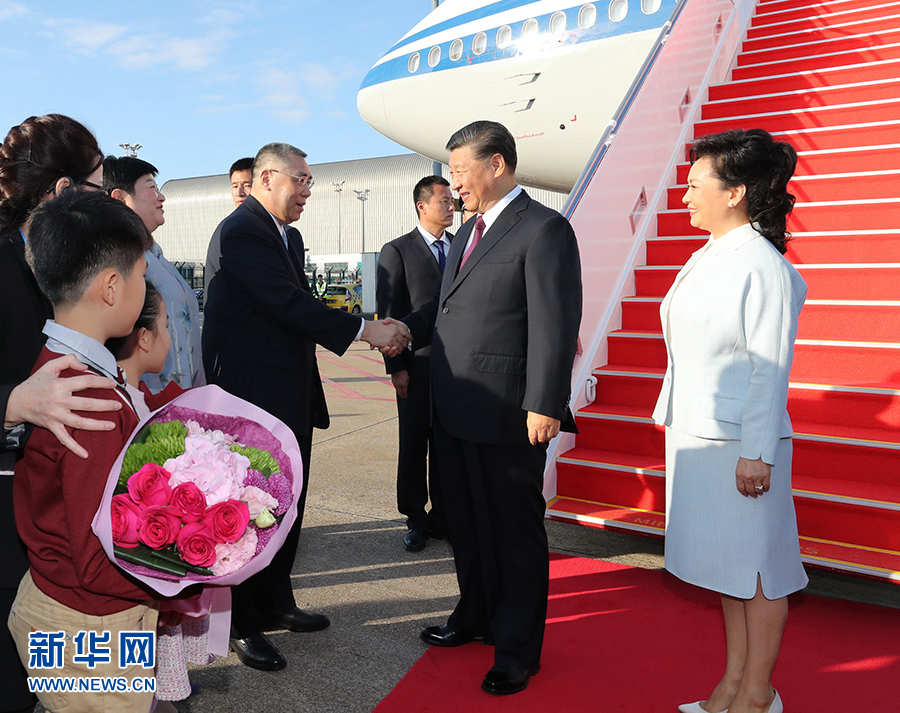 12月18日,中共中央总书记、国家主席、中央军委主席习近平乘专机抵达澳门,出席将于20日举行的庆祝澳门回归祖国20周年大会暨澳门特别行政区第五届政府就职典礼并视察澳门。这是习近平同前来机场迎接的澳门特别行政区行政长官崔世安亲切握手。 新华社记者 鞠鹏 摄