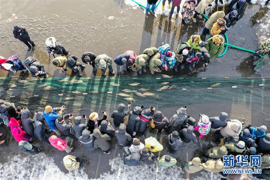 12月18日,人们在诺干湖观看冬捕活动(无人机拍摄)。 当日,位于内蒙古呼伦贝尔大草原上的诺干湖举行冬捕活动,吸引不少游客前来观看。冬日的诺干湖冰雪覆盖,诺干湖冬捕也是当地冬季旅游的特色活动之一。 新华社记者 刘磊 摄