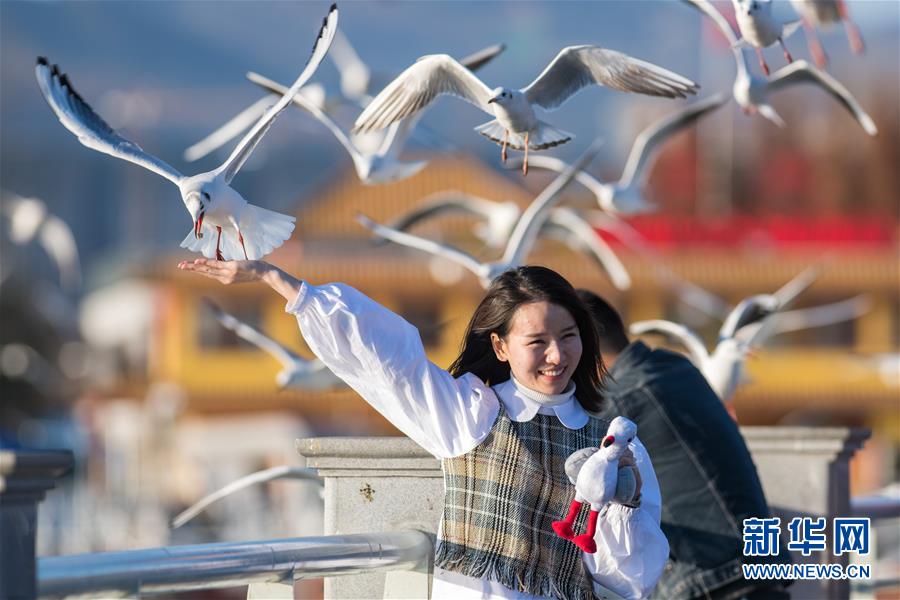 12月18日,一名女孩在昆明海埂大坝投喂红嘴鸥。 近日,“春城”昆明阳光明媚,气候宜人,市民游客纷纷来到海埂大坝、翠湖公园等地,与前来越冬的红嘴鸥近距离接触,人鸥同乐。红嘴鸥是云南昆明的“荣誉市民”,每年秋冬季都会来到昆明越冬。 新华社记者 胡超 摄