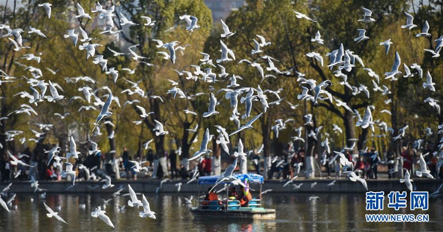 12月19日,人们在昆明翠湖公园观赏、投喂红嘴鸥。 近日,“春城”昆明阳光明媚,气候宜人,市民游客纷纷来到海埂大坝、翠湖公园等地,与前来越冬的红嘴鸥近距离接触,人鸥同乐。红嘴鸥是云南昆明的“荣誉市民”,每年秋冬季都会来到昆明越冬。 新华社记者 蔺以光 摄