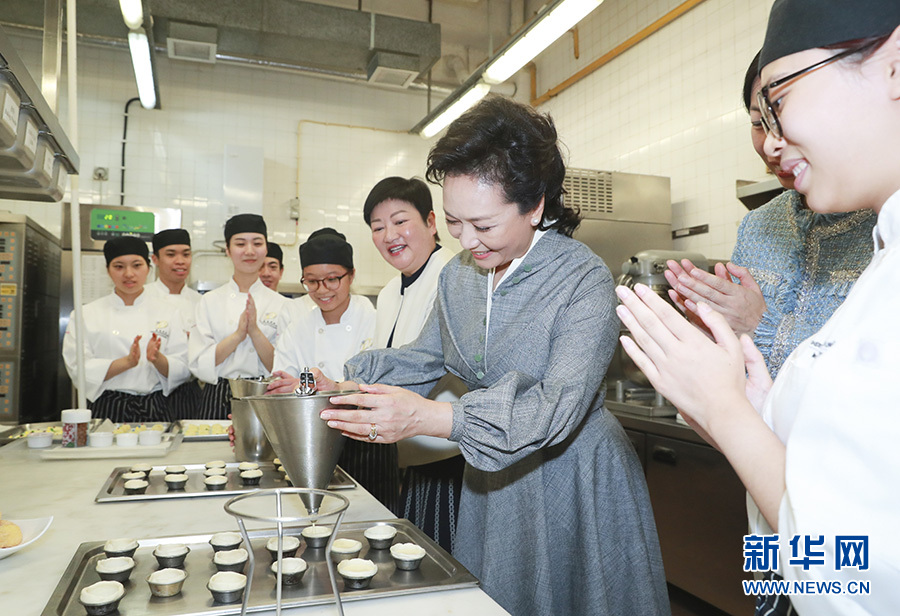 12月19日,国家主席习近平夫人彭丽媛在澳门特别行政区行政长官崔世安夫人霍慧芬陪同下,来到澳门旅游学院参观。这是彭丽媛拿起蛋液漏斗参与制作葡式蛋挞。 新华社记者 丁林 摄