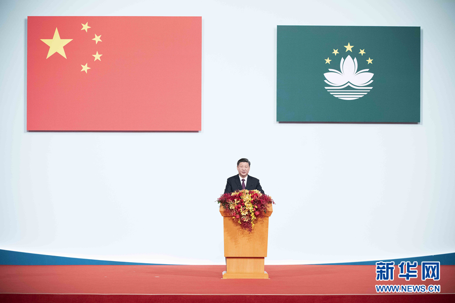 12月20日,庆祝澳门回归祖国20周年大会暨澳门特别行政区第五届政府就职典礼在澳门东亚运动会体育馆隆重举行。中共中央总书记、国家主席、中央军委主席习近平出席并发表重要讲话。 新华社记者 李涛 摄