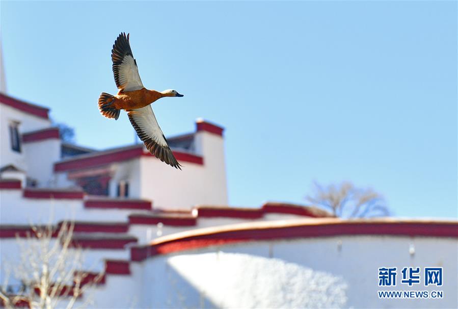 一只赤麻鸭从布达拉宫旁飞过(12月20日摄)。冬日,西藏拉萨市布达拉宫脚下的龙王潭公园成了鸟的“天堂”。数不尽的斑头雁、赤麻鸭、红嘴鸥在这里嬉戏、觅食。新华社记者 张汝锋 摄