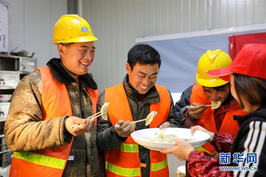 12月21日,农民工在安九铁路安徽段项目工地上品尝刚出锅的饺子。 当日,在安九铁路安徽段项目工地上,农民工和志愿者一起包饺子、迎冬至,感受冬日别样的温暖。 新华社记者 曹力 摄