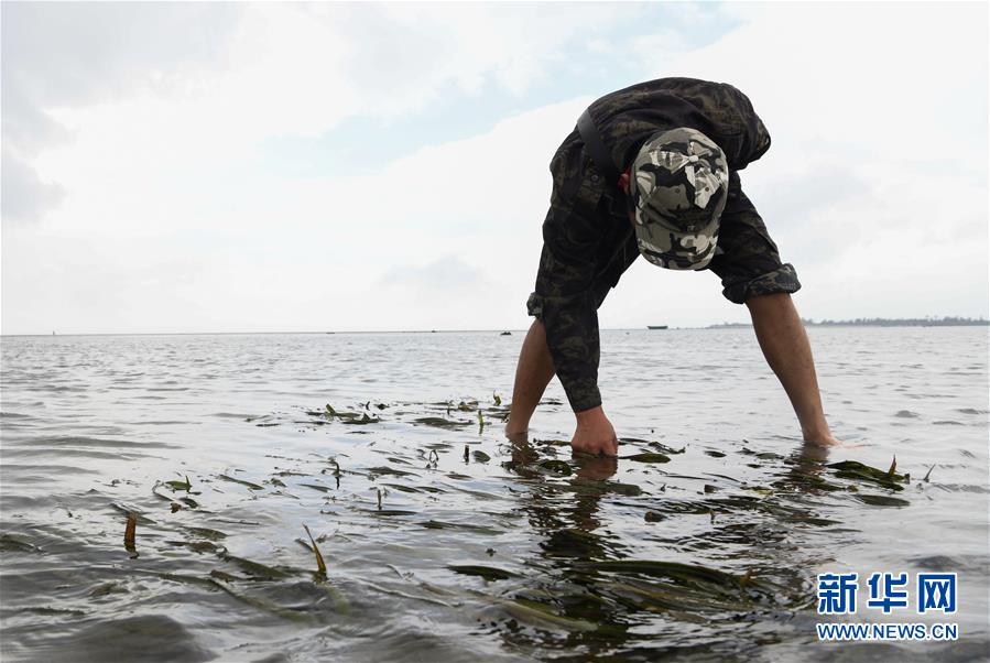 海南清澜港省级自然保护区护林员吕诗阳在保护区内的滩涂上查看海草情况(12月17日摄)。 吕诗阳2012年来到保护区工作,目前他的主要工作是对保护区内的动植物进行巡护、监测。他在工作中对红树林产生了浓厚的兴趣,不断学习相关知识。通过他的不懈努力,周边村民也逐渐意识到红树林的重要性,对红树林的保护也非常积极。 新华社记者杨冠宇摄