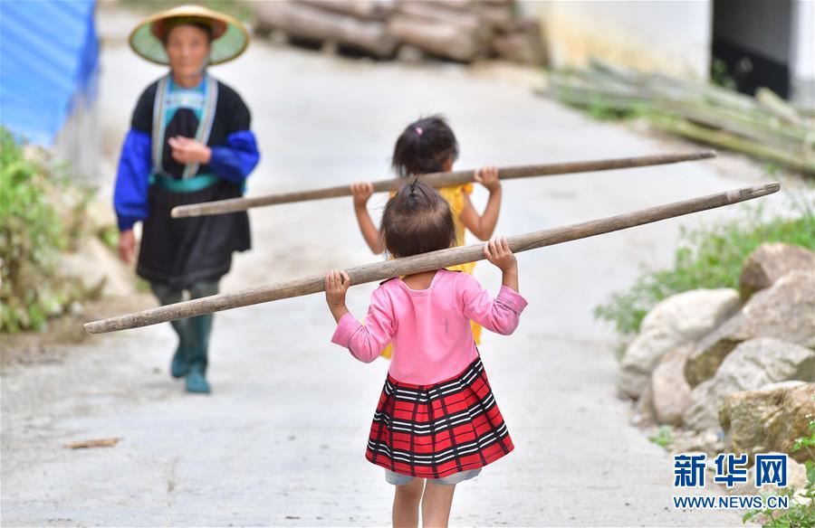 乌英苗寨的两名小朋友帮大人拿扁担回家(9月2日摄)。 新华社记者 黄孝邦 摄
