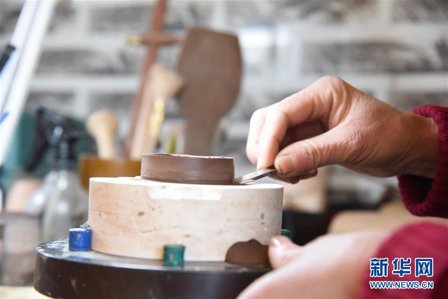 徐明娟在制作紫砂壶底座(12月18日摄)。 新华社记者 梁冬 摄