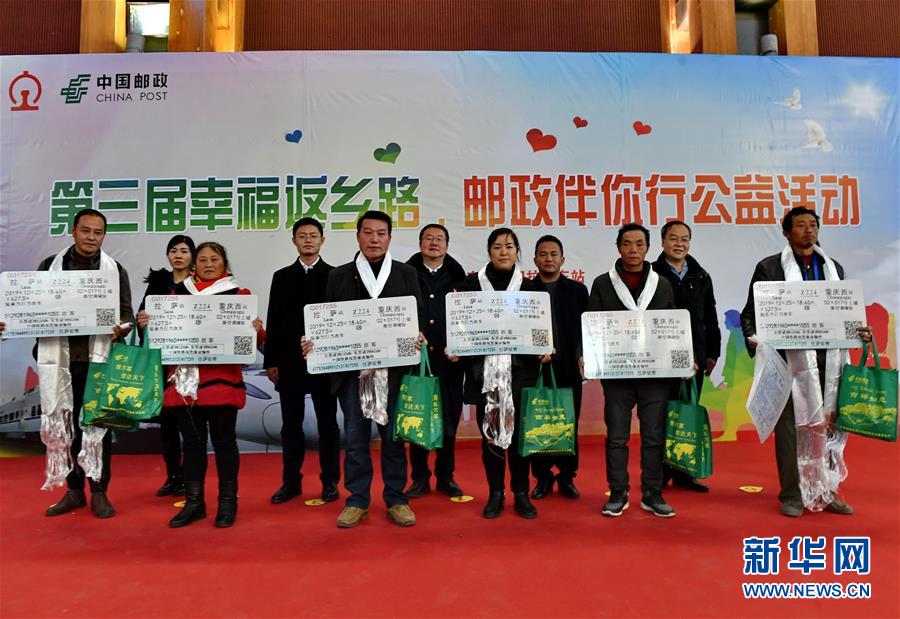 12月23日,在拉萨火车站,中国邮政集团公司西藏自治区分公司和青藏铁路公司负责人与受助务工人员代表合影。当日,由中国邮政集团公司西藏自治区分公司和青藏铁路公司拉萨站共同组织的第三届“幸福返乡路·邮政伴你行”免费赠送火车票公益活动在拉萨火车站举行。中国邮政集团公司西藏自治区分公司出资20余万元购买12月23日至12月26日拉萨至成都、重庆、西宁、兰州方向共计436张火车票,免费赠送给西藏外来务工人员。青藏铁路公司拉萨站为受助务工人员设置专用安检通道和候车专区。 新华社记者 张汝锋 摄