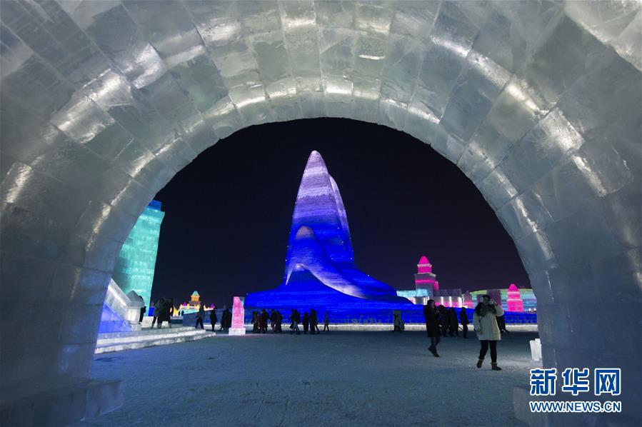 12月23日,游客在哈尔滨冰雪大世界园区游玩。 当日,以“冰雪共融 欢乐同行”为主题的第二十一届哈尔滨冰雪大世界正式开园。 新华社发(谢剑飞 摄)