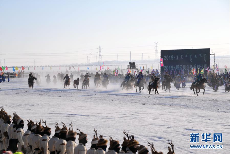 12月23日拍摄的呼伦贝尔冬季那达慕开幕式表演。当日,2019呼伦贝尔冬季那达慕在内蒙古呼伦贝尔市陈巴尔虎旗的那达慕会场开幕,为游客献上一场冰雪上的“视觉盛宴”。新华社记者 徐钦 摄