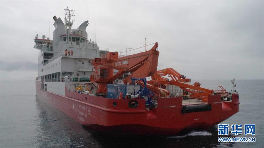 12月24日,科考队员在“雪龙2”号船尾回收海洋走航剖面仪(无人机拍摄)。新华社记者 刘诗平 摄