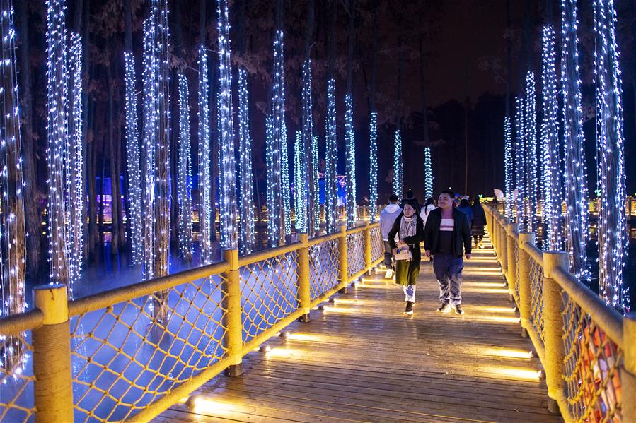 12月24日,游客在武汉欢乐谷的灯海中游玩。 时值岁末,武汉欢乐谷举办奇幻灯光节,亮起各式彩灯,吸引不少游客前来游玩。 新华社记者熊琦摄
