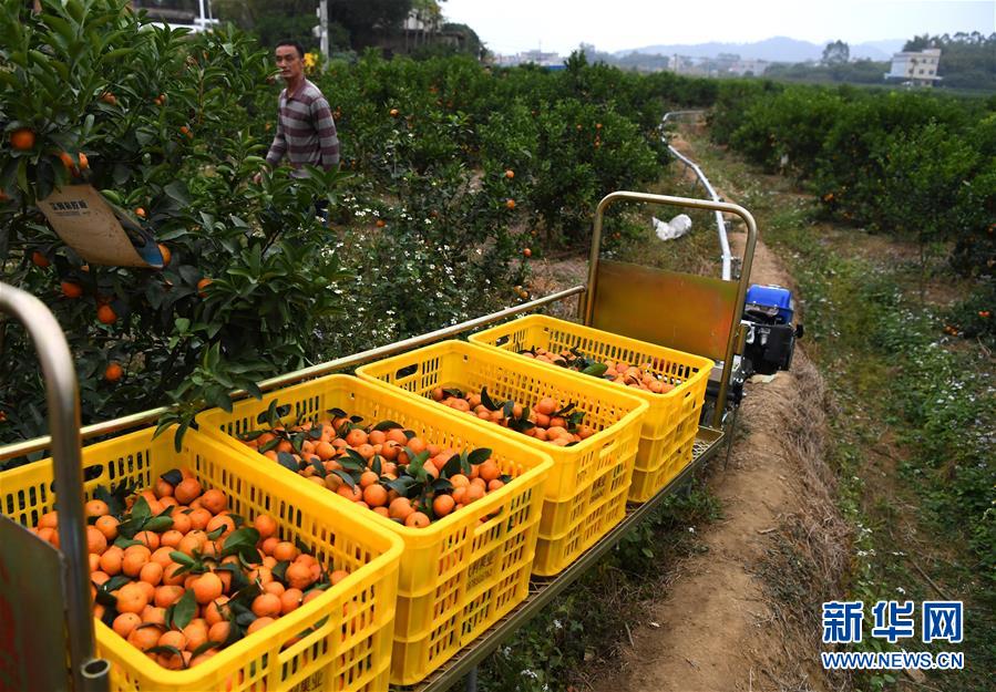 12月24日,在广西北流市塘岸镇利民村,村民利用自动轨道车运送刚刚采摘的沙糖橘。 广西北流市塘岸镇利民村曾是一个贫困村,近几年该村大力发展沙糖橘种植,助力全村成功脱贫。2019年,利民村沙糖橘种植面积已超过1000亩,预计总产量480万斤。 新华社记者 周华 摄