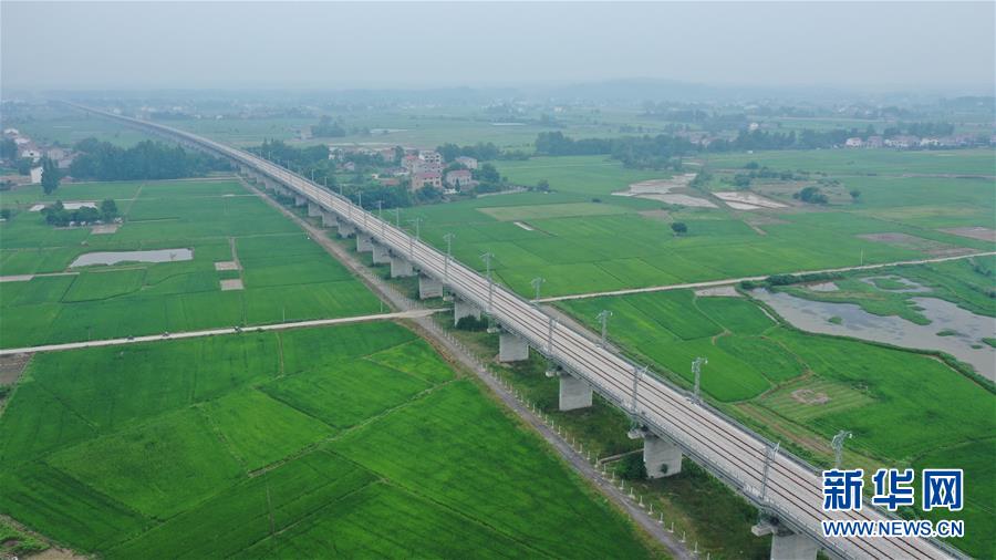 这是黔张常铁路位于湖南省常德市桃源县境内的白洋河特大桥(6月11日无人机拍摄)。 当日,黔张常铁路正式通车。这条西起重庆黔江区,途经湖北,东至湖南常德的铁路,全长330余公里,运营时速200公里。 新华社发(丁洋 摄)