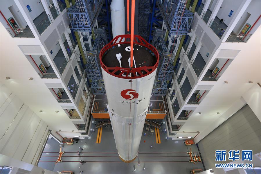 这是在厂房吊装过程中的长征五号遥三运载火箭(11月7日摄)。新华社发(屠海超 摄)