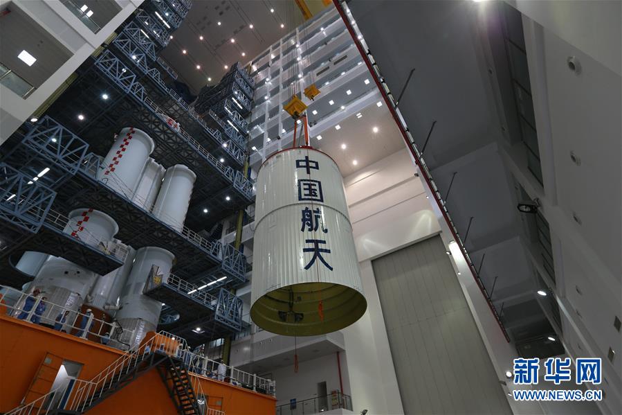这是在厂房吊装过程中的长征五号遥三运载火箭(11月14日摄)。新华社发(屠海超 摄)