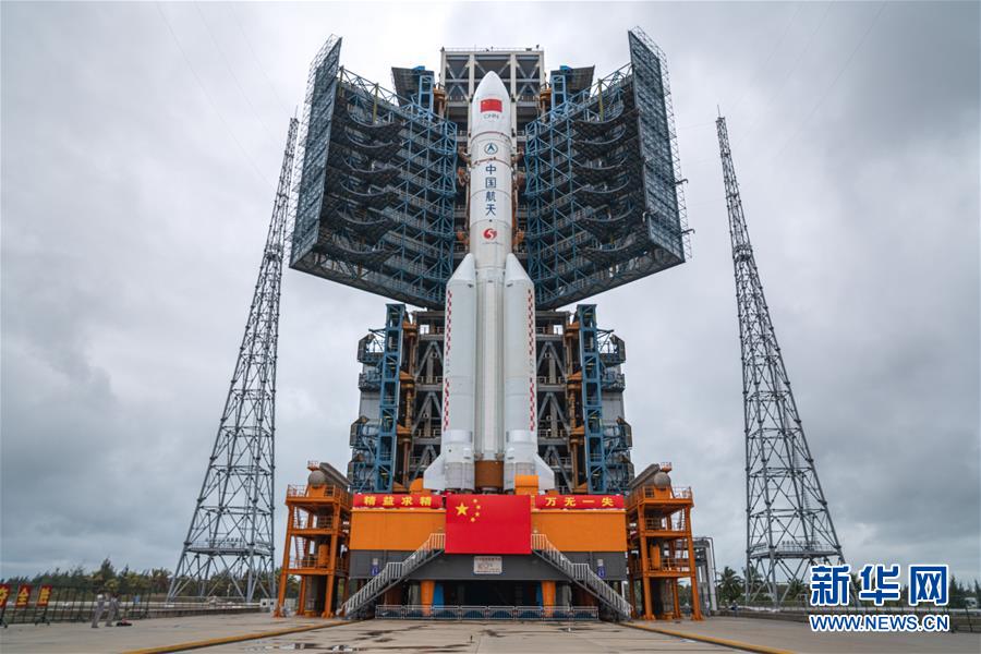 长征五号遥三运载火箭在中国文昌航天发射场完成技术区相关工作后,垂直转运至发射区(12月21日摄)。新华社发(郭文彬 摄)