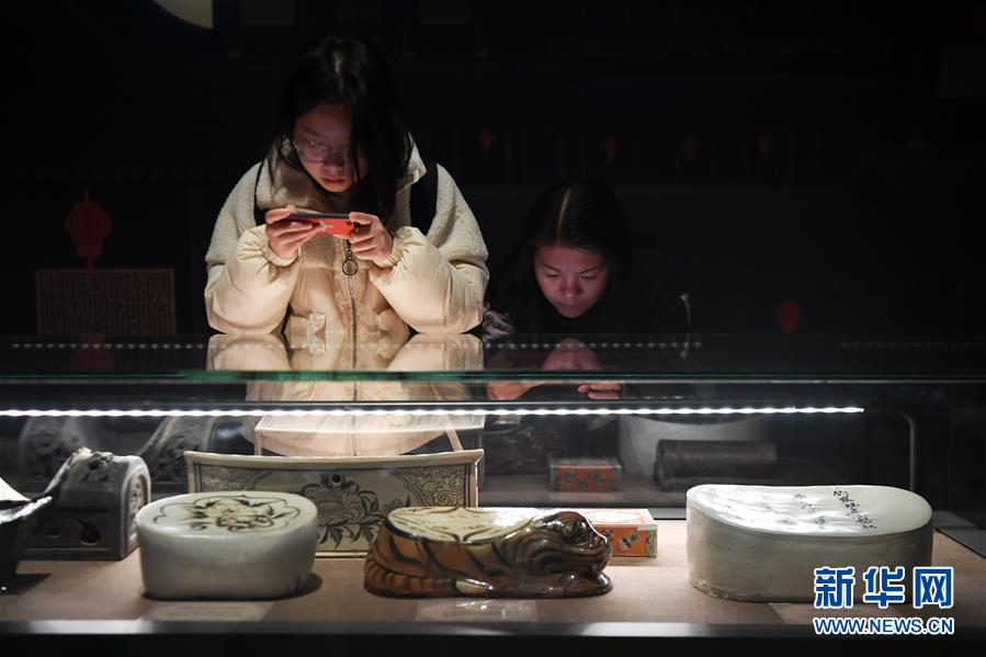12月28日,参观者在长沙博物馆“千年梦华——中国历代枕文物特展”上观赏拍照。新华社记者 薛宇舸 摄