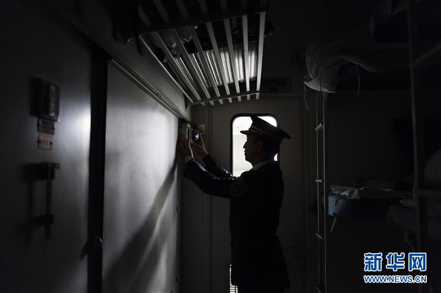 12月27日,王轩在K7065次列车上检查监控设备。新华社发(谢剑飞 摄)