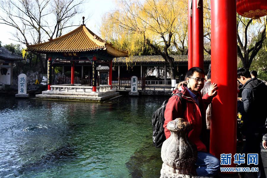 12月28日,游客在趵突泉边赏泉。 时值冬日,被誉为“天下第一泉”的山东济南趵突泉持续喷涌,吸引众多游客前来观赏。据了解,自2003年9月6日复涌至今,趵突泉已实现16年连续喷涌。 新华社记者 尹绪宝 摄