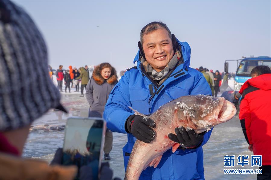 12月27日,在查干湖冰面上,游客手捧刚打捞上来的大鱼拍照留念。新华社记者 张楠 摄