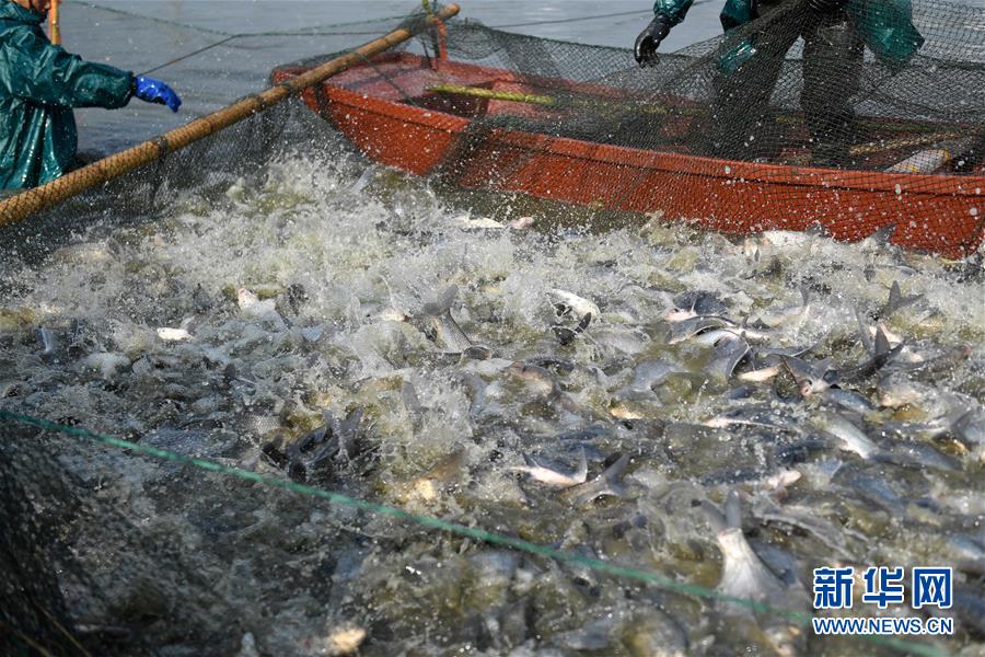 12月28日,渔民们在菱湖镇盛江家庭农场拉网捕鱼。新华社记者 黄宗治 摄