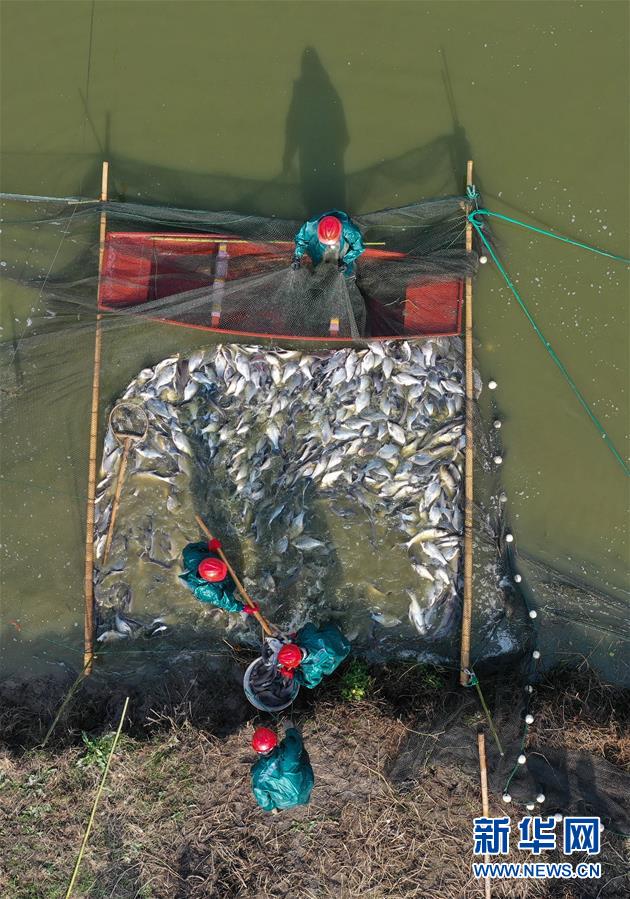 12月28日,渔民们在菱湖镇盛江家庭农场拉网捕鱼(无人机拍摄)。新华社记者 黄宗治 摄