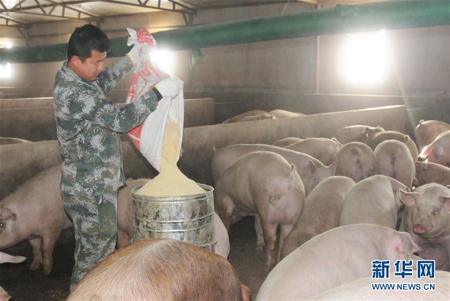 12月28日,内蒙古巴彦淖尔市临河区旭光村养殖户张权在投喂饲料。新华社记者 李云平 摄