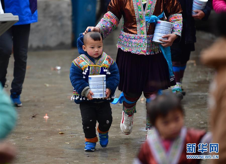 12月28日,乌英苗寨的小朋友收到爱心奶粉。新华社记者 黄孝邦 摄