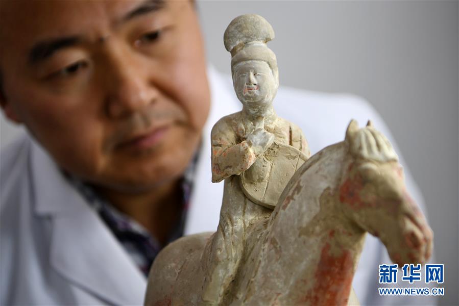 12月27日,在天水市博物馆文物保护修复中心陶、玉石器文物修复室,专业技术人员孟旭辉在观察一件唐代彩绘陶俑的病害情况。 甘肃省天水市博物馆文物保护修复中心有一支专业的文物修复队伍,共有14名专业技术人员。从2012年正式成立以来,他们不仅承担着对馆藏和馆外文物的修复工作,还参与了多次文化遗存的调查和抢救性发掘、古建筑彩画保护、古墓葬搬迁复原等工作。一件件残缺破损、满身病害的文物经过他们的巧手修复,又重新焕发光彩,展示在公众面前。 新华社记者 马宁 摄