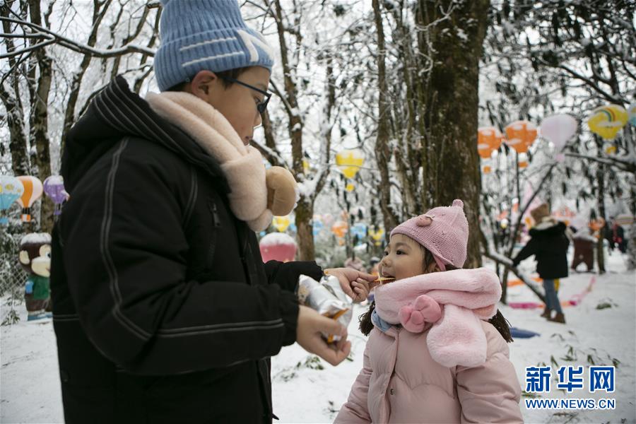 12月28日,小朋友在峨眉山风景名胜区吃零食。新华社记者 李梦馨 摄