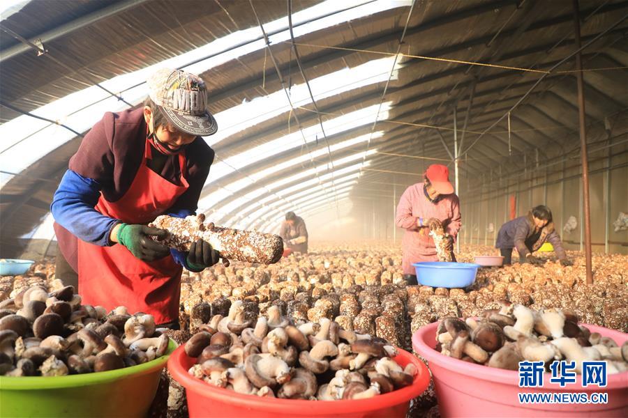12月28日,河北省唐山市丰润区小美食用菌种植农民专业合作社社员在大棚内采摘香菇。新华社记者 牟宇 摄