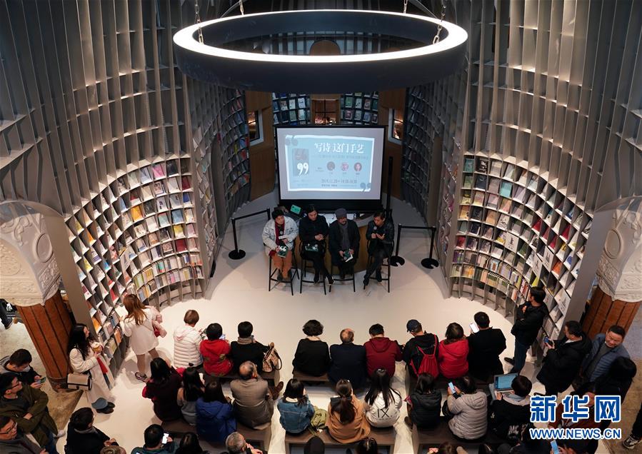 12月28日,一场诗歌主题沙龙在思南书局·诗歌店内举行。 当日,上海世纪出版集团打造的诗歌主题书店——思南书局·诗歌店在上海开业。该书店陈列着多个国家出版的诗集作品,另有散文、传记、绘本等相关文学艺术书籍。 新华社记者 刘颖 摄